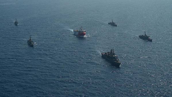 Turkish Navy vessels escorting the Oruc Reis seismic vessel - Credit: Turkish Defense Ministry