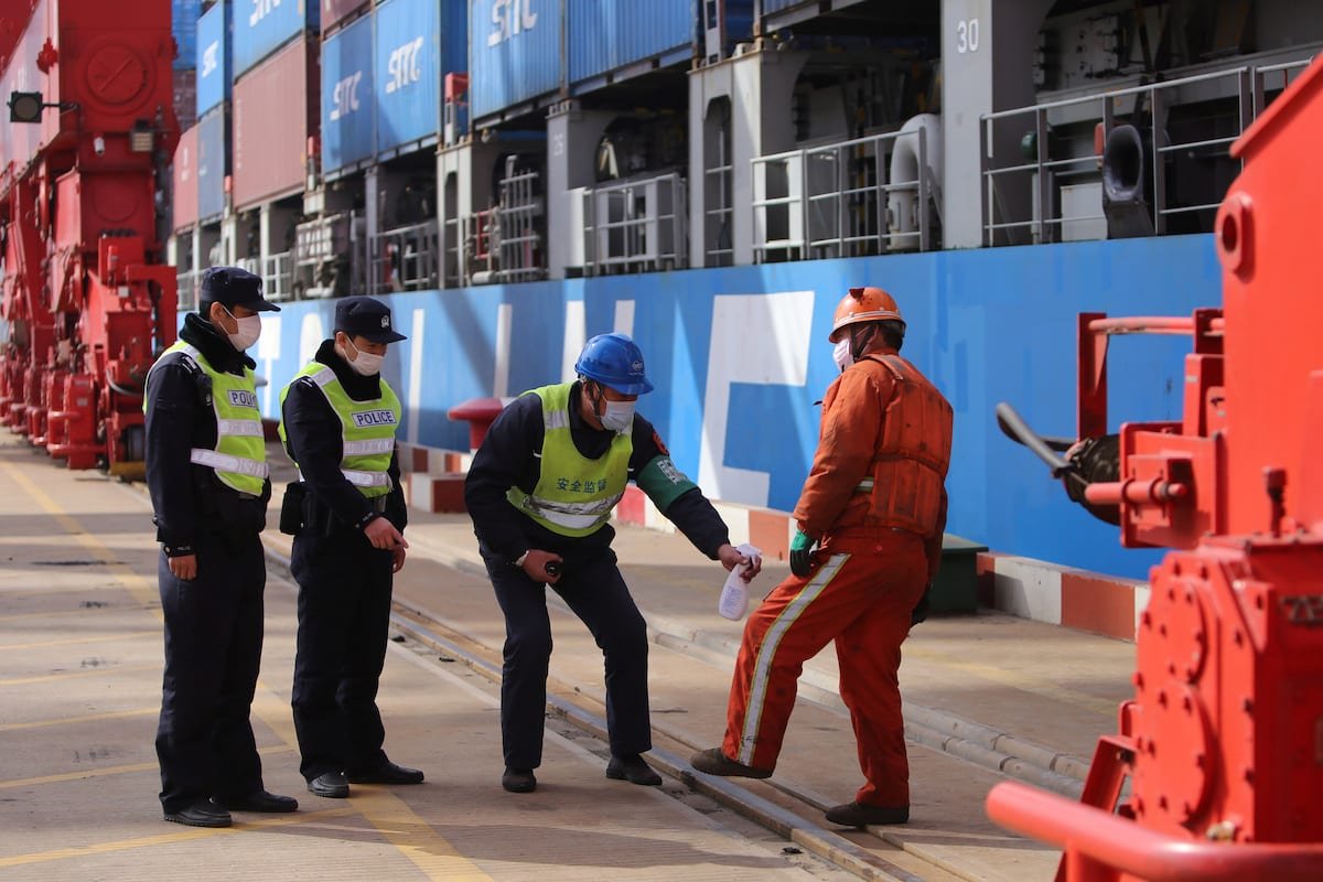 Police policemans, using face masks, manage the sanitation of an employee near a ship with containers at a port in Lianyungang, Jiangsu district, China March 12, 2020. cnsphoto through REUTERS