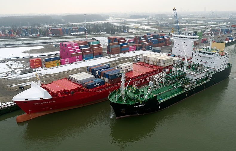 The MV Containerships Nord visualized throughout its initial LNG bunkering in January 2019. Photo: Containerships