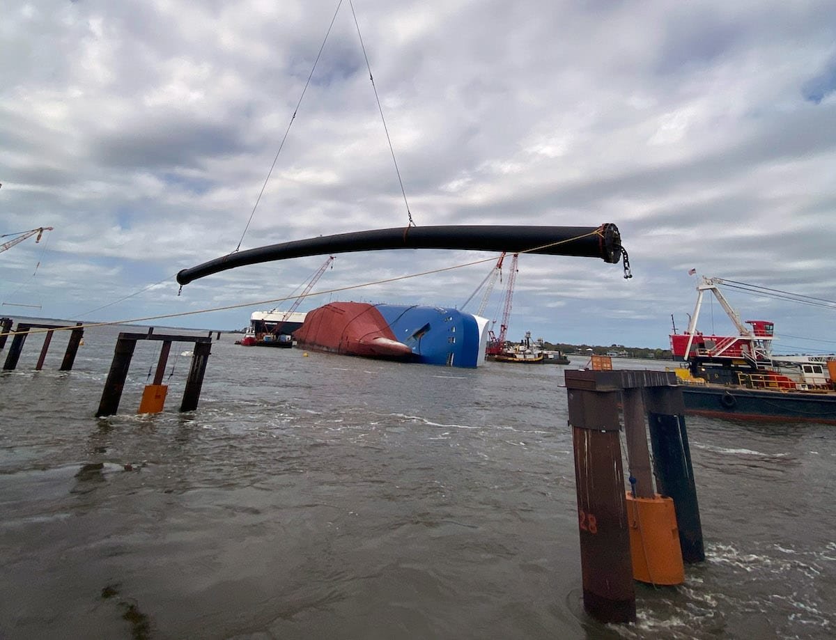 Meanwhile, a group from T&T Salvage has actually mounted the very first of 16 training lugs to the MVGolden Ray