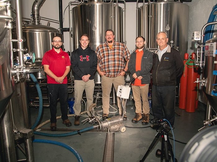 Shipbuilders from Newport News Shipbuilding’s E25 Noise and Vibration Test Engineering (NVTE) unit examined a newly acquired video vibration evaluation instrument at Coastal Fermentory. [Photo by Ashley Cowan]
