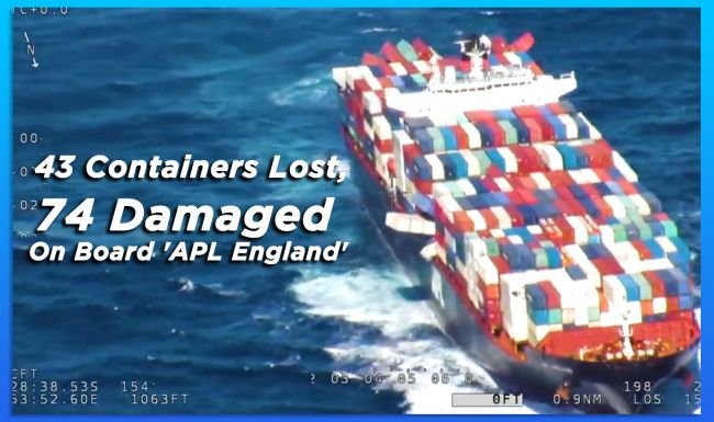 The Master of the APL England has actually reported that 40 containers were shed crazy, 74 containers have actually been harmed. Six containers are reported to be extending from starboard side, and also 3 from the port side of the ship.