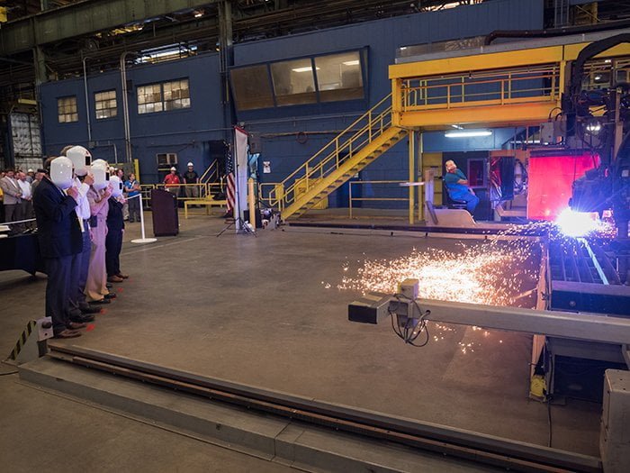 With journalism of a switch, a plasma-burning device reduced the very first steel plate that will certainly be utilized to develop the lead vessel, Columbia (SSBN 826).