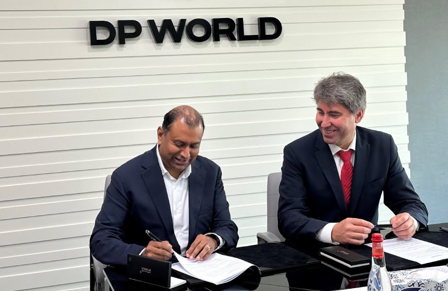 Mike Bhaskaran, Group Chief Technology Officer, Digital Technology, DP World and Murat Seitpesinov, Chairman of the Integral Petroleum Group signing the new agreement