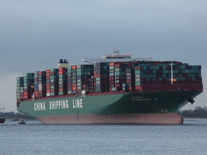 FEBRUARY 5, 2016–The 19,000 TEU containership CSCL Indian Ocean today stayed based in the Elbe River off the island of Lühesand on the strategy to Hamburg.